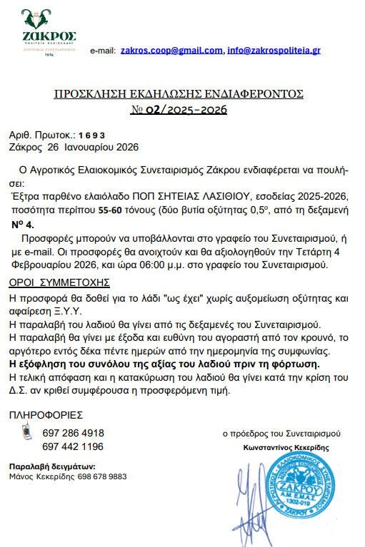 Ο Συνεταιρισμός προσκαλεί τους ενδιαφερόμενους για αγορά ελαιόλαδου bulk να υποβάλλουν τις προσφορές τους έως 4/2/2026, στις 06:00 μ.μ
